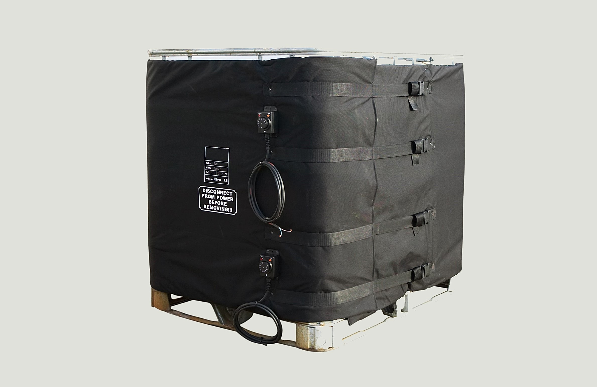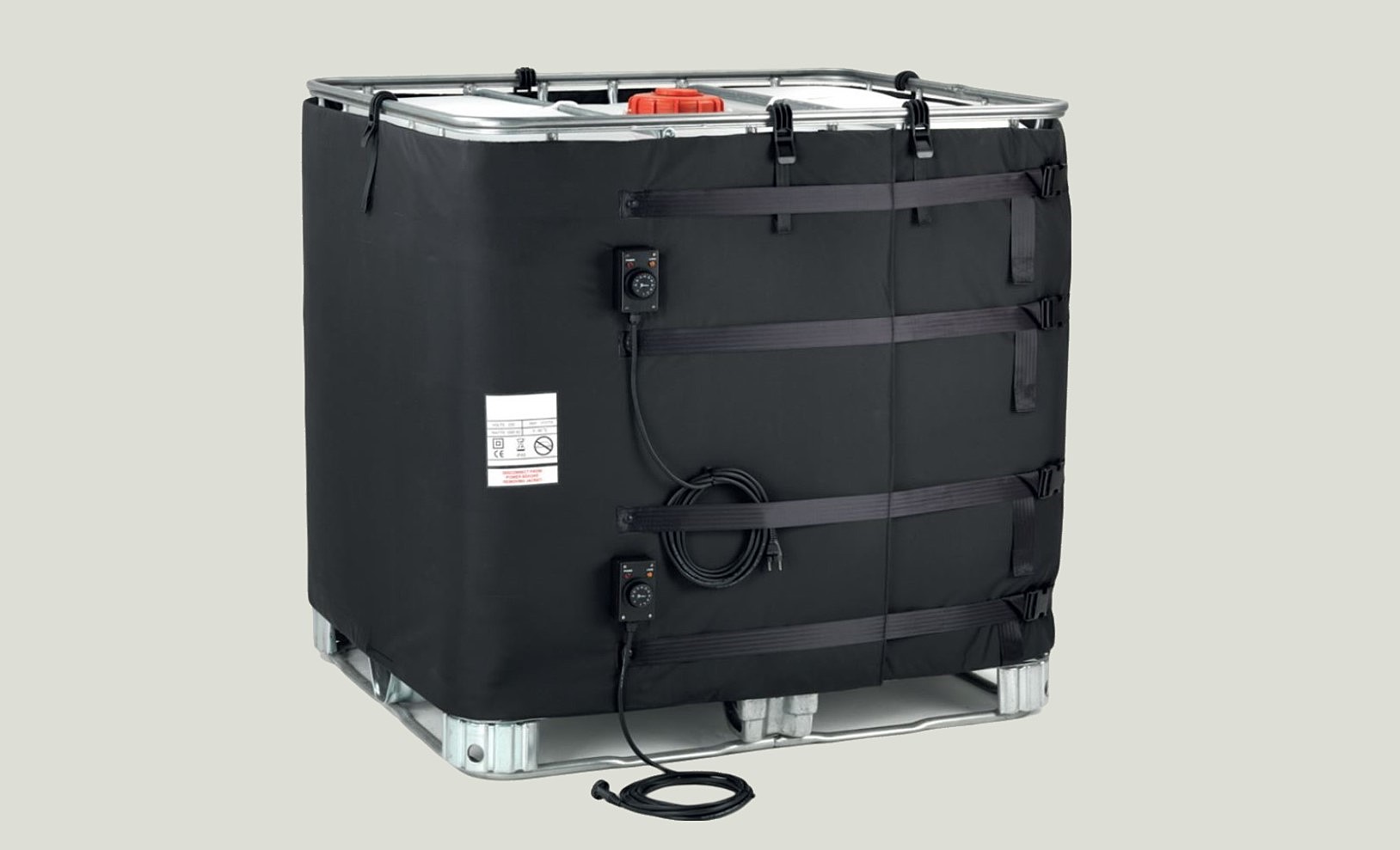 La fascia scaldafusto elettrica per cisterna IBC o coperta termica per fusto è prodotta con un tessuto di ottima qualità ed estremamente resistente, il riscaldatore incorpora, per ognuno dei due settori riscaldanti, una resistenza di 1000W controllata da un termostato a capillare 0-40°C o 0-90°C. Lo scaldafusto è fornito con un semplice ed efficace sistema di fissaggio con cinghie di trazione per un’installazione ottimale.